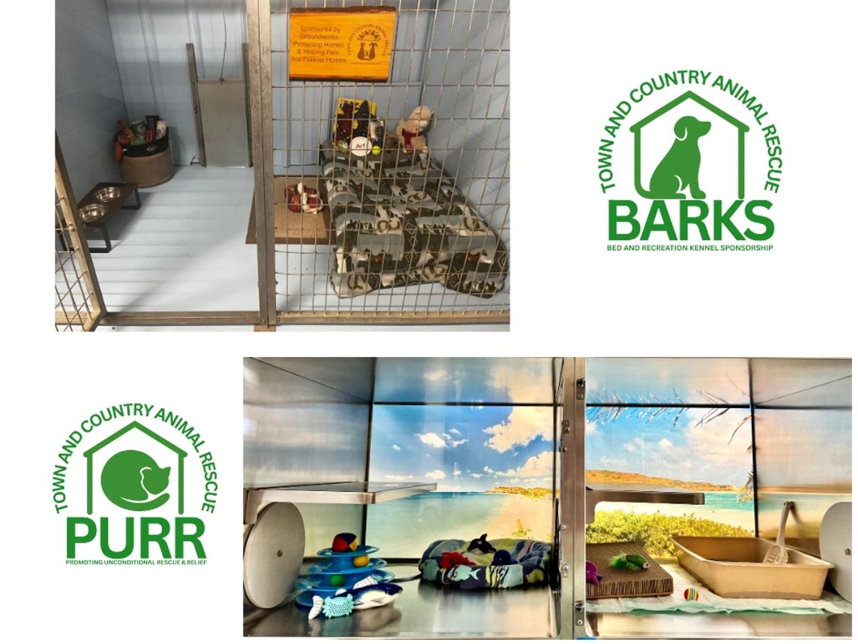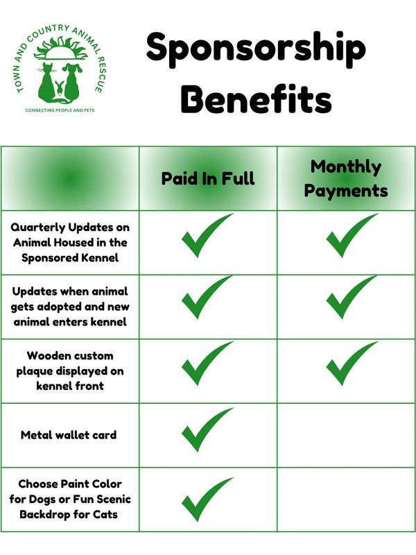 As a treasured BARKS or PURR Program member, you can rest assured that we are caring for the safety and well-being of the resident animal in your sponsored kennel. You are under no obligation to visit or provide day-to-day care; we’ll take care of all of that! Your generous donation helps us provide the best care for the kennel residents. The ongoing day-to-day care, healthcare, and upkeep of the kennel are the sole responsibilities of Town and Country Animal Rescue Management, designated staff, and Board of Directors.